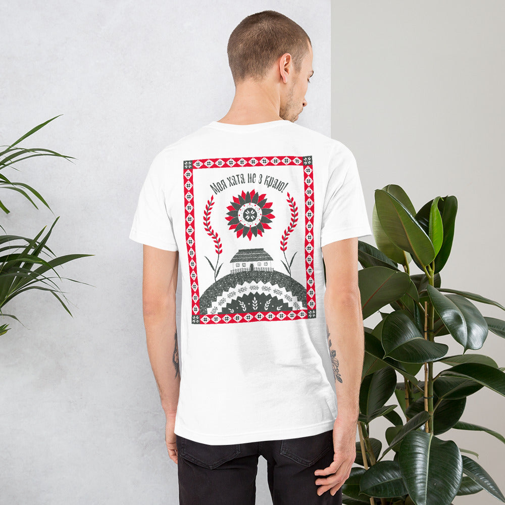 Pronounced “HA-ta”, Khata means cottage in Ukrainian. Inscribed on the back, Моя хата не з краю, pronounced “moya khata ne z krayu”, loosely translates to, “my house is not on the edge”.